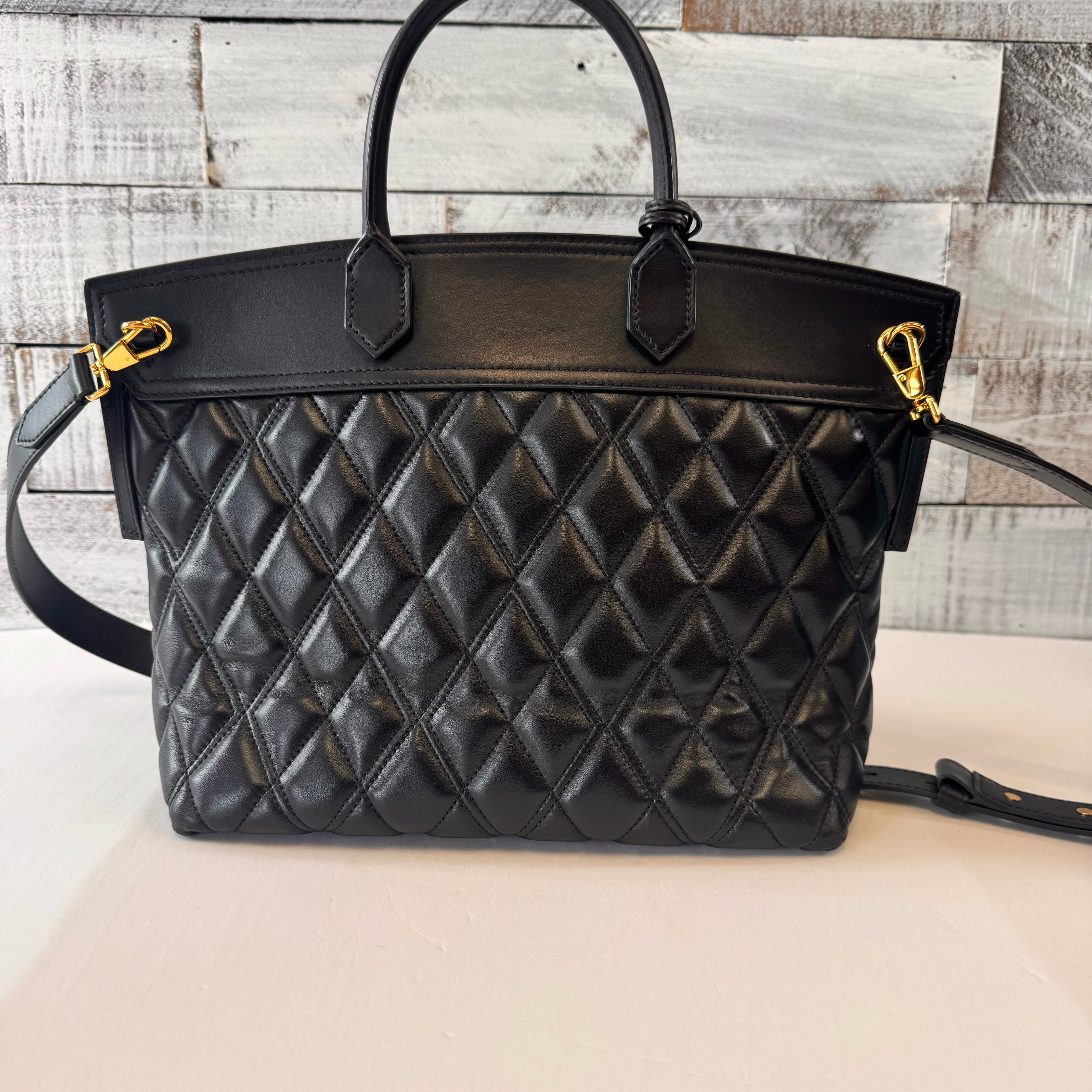 Quilted Society with long cross body strap and top handle 10" tall, 13" long, 5.5" deep
