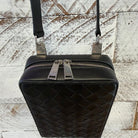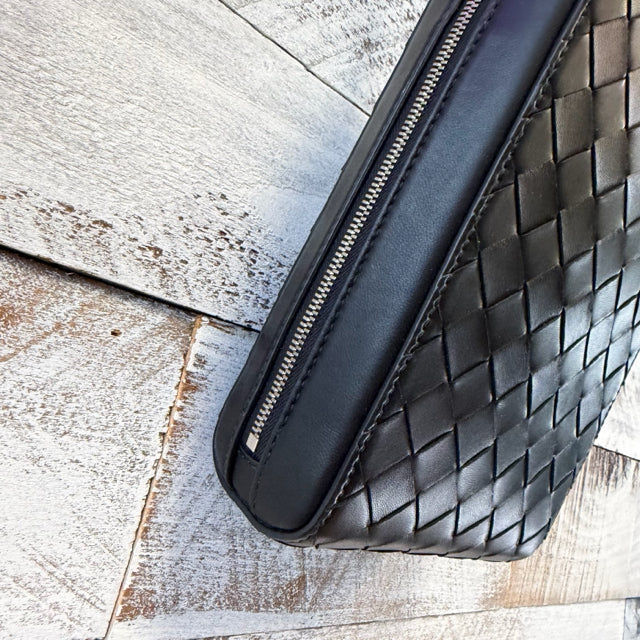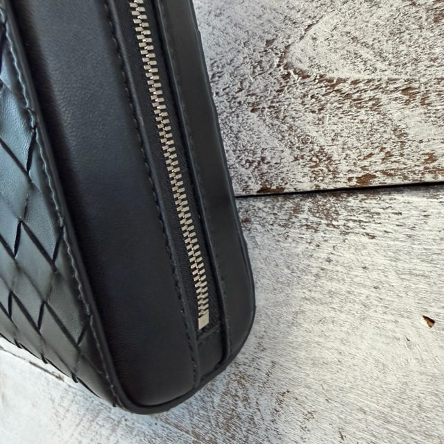 unisex Intrecciato zip around crossbody 8" tall, 5" wide, 2.25" deep, silver hardware