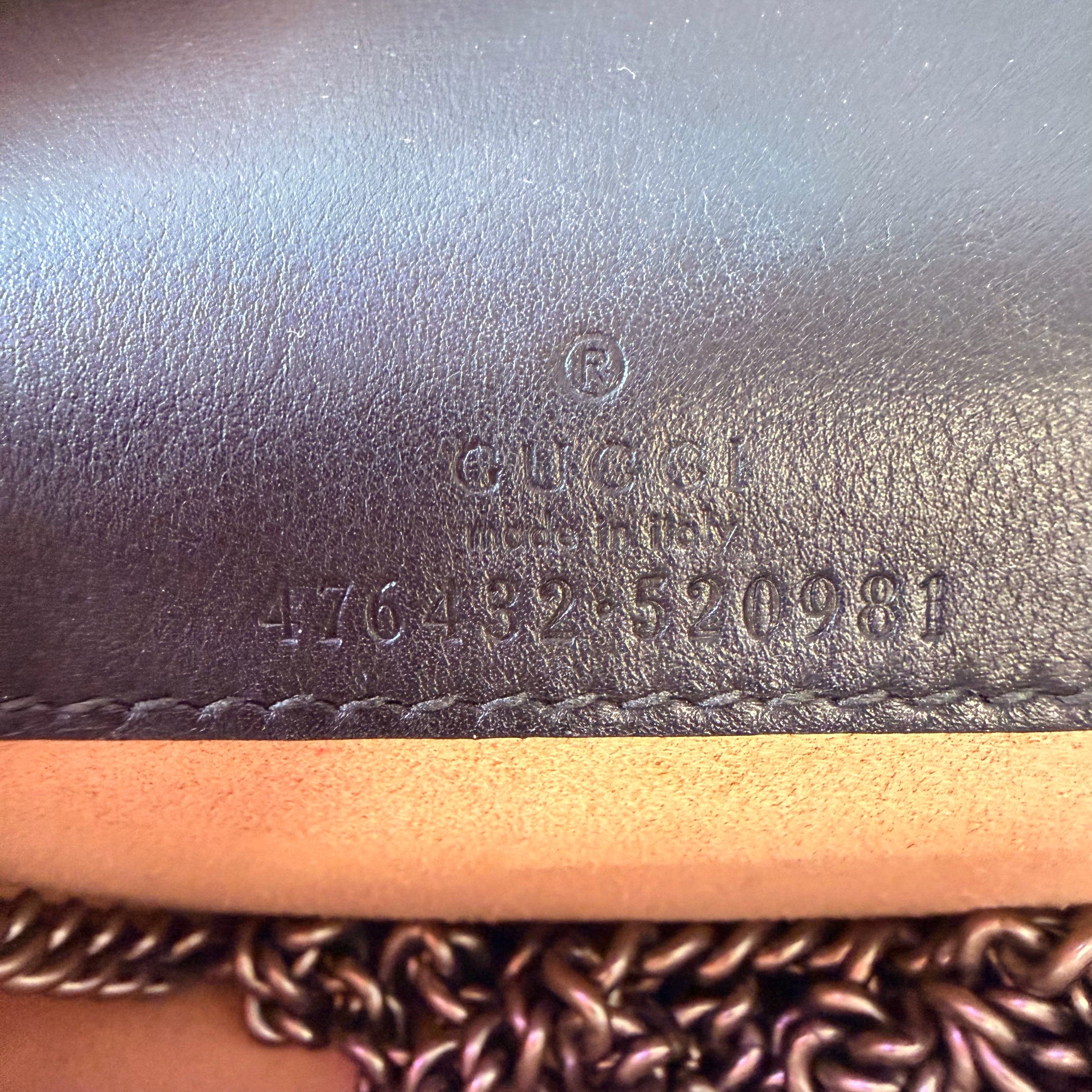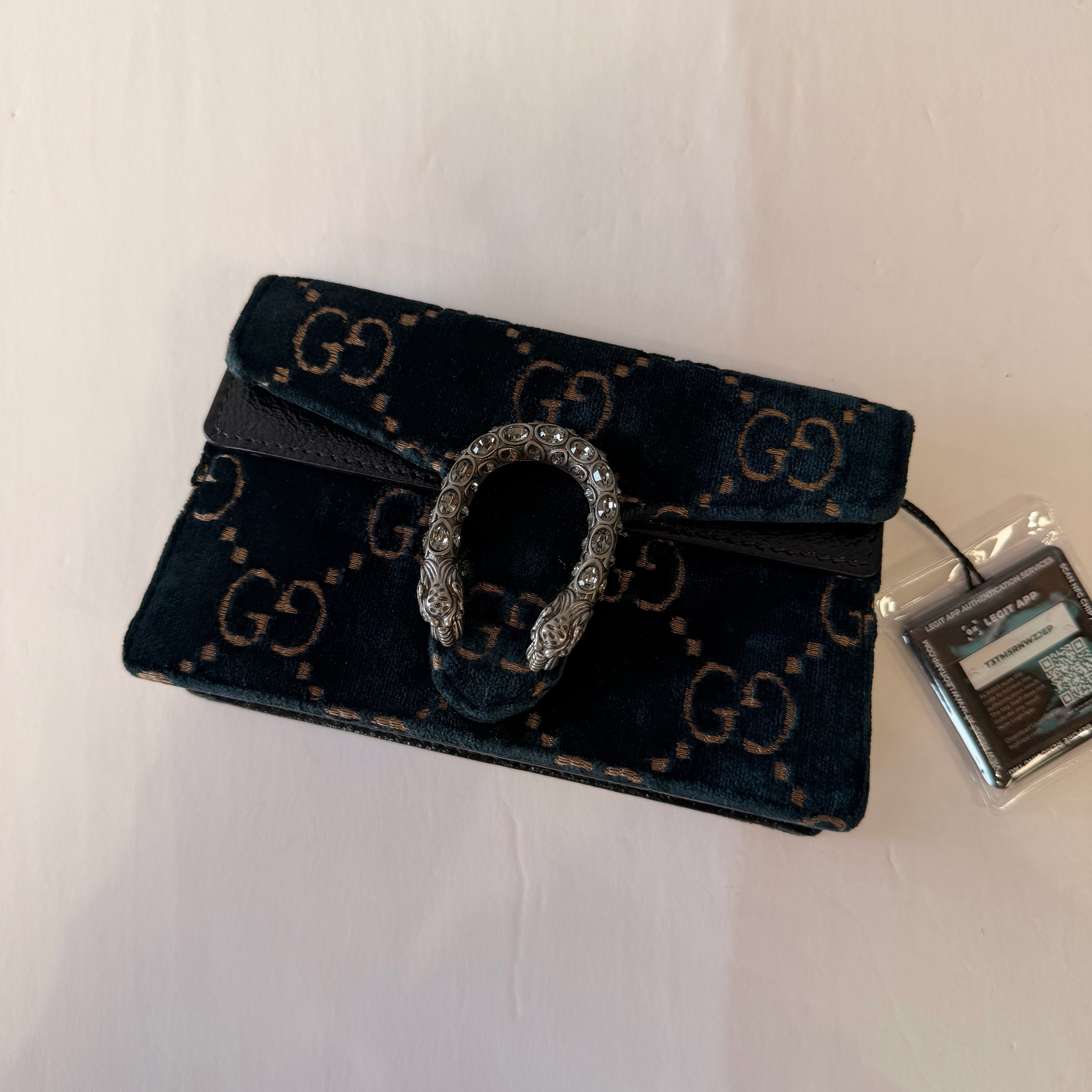 Dionysus GG super mini with burn out GG, encrusted tiger head snap closure 4" tall, 6.5" long, 1.5" deep