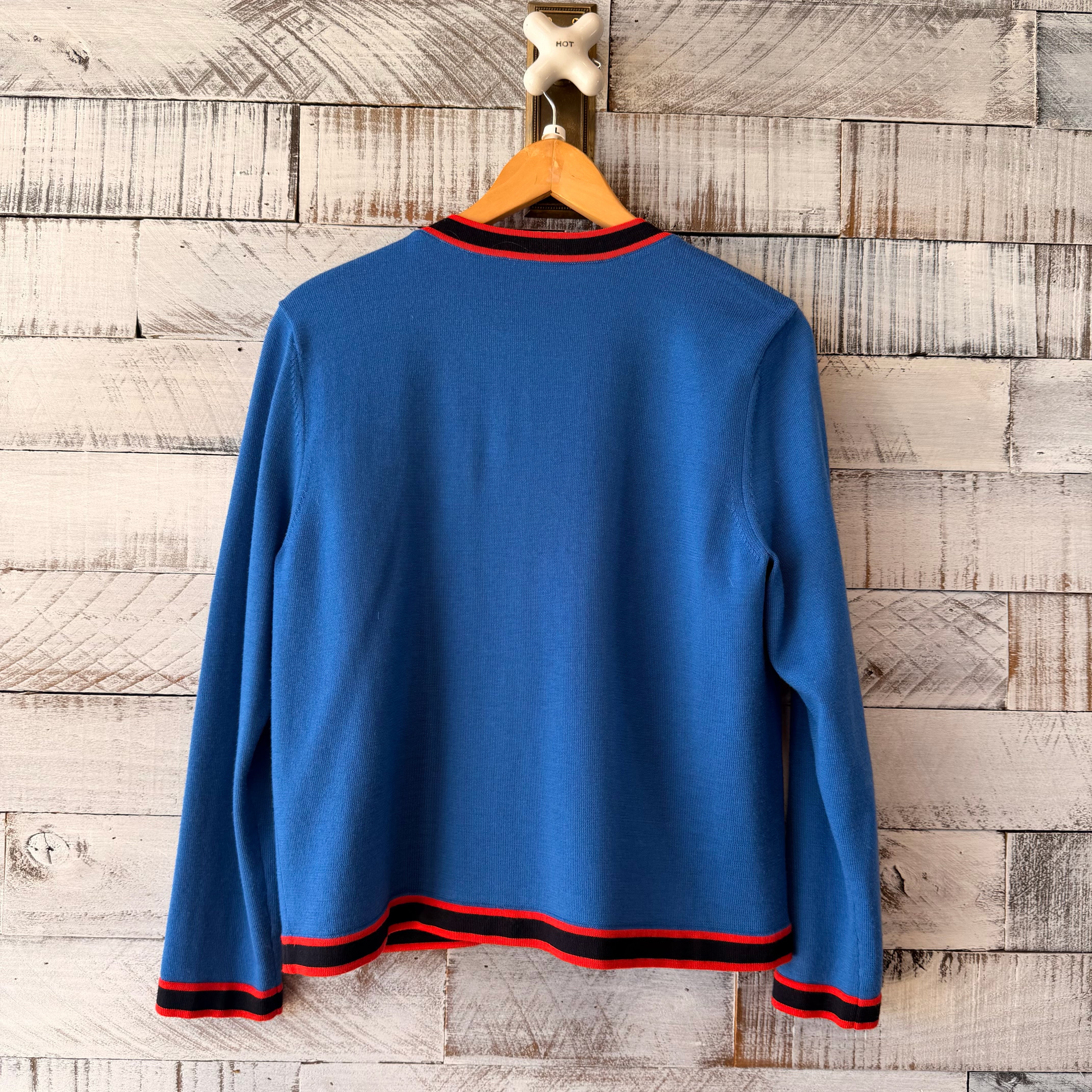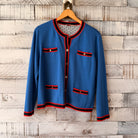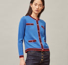 Kendra Cardigan with red trim and black trim, gold buttons